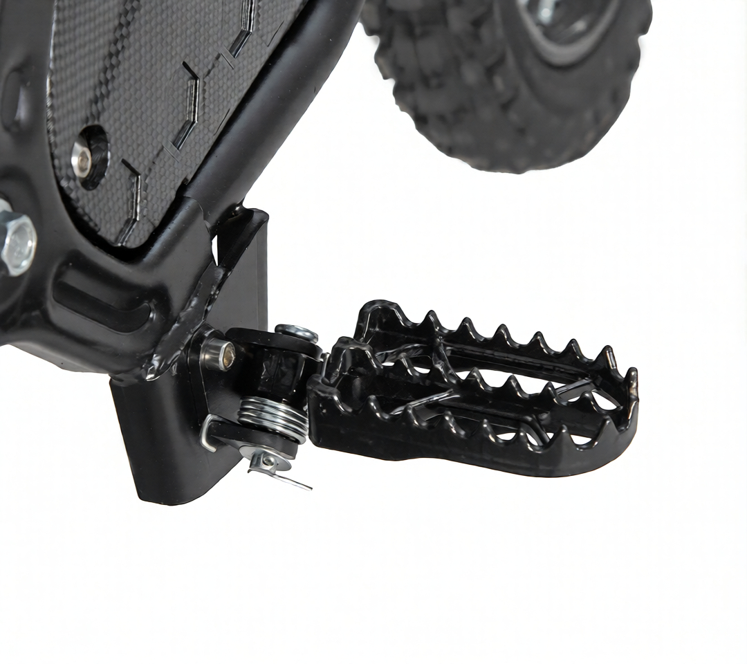 Электропитбайк также оснащен эффективным освещением, включая передний фонарь и задние стоп-огни, что значительно повышает видимость в темное время суток. Ручка газа мотоциклетного типа позволяет легко регулировать скорость, что добавляет удобства в управлении и делает поездки более комфортными.