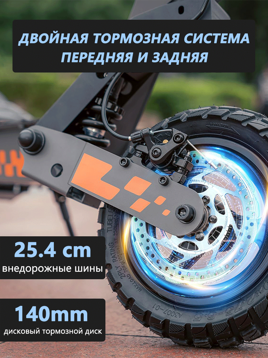 Бесщеточный электродвигатель имеет номинальную мощность 800 Вт и пиковую 1200 Вт, что обеспечивает резвый разгон и уверенное преодоление подъемов до 20 градусов. Аккумуляторная батарея напряжением 48 В и емкостью 15600 мА·ч питает двигатель и обеспечивает запас хода до 55 км на одном заряде. Максимальная скорость достигает 45 км/ч, позволяя динамично передвигаться в городском потоке.